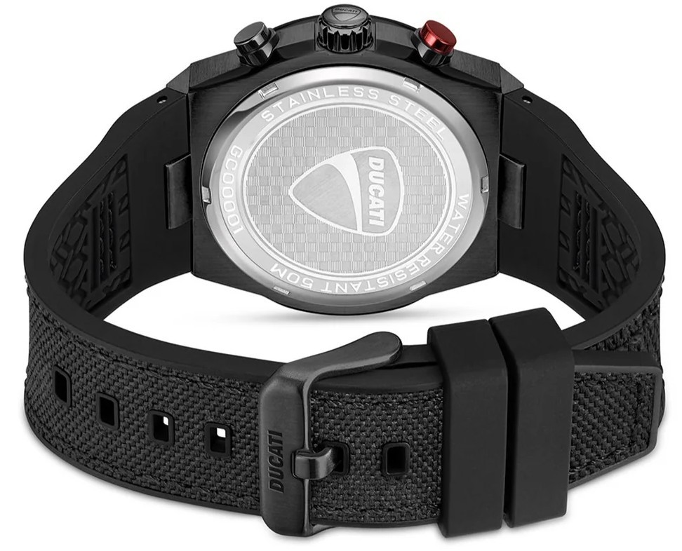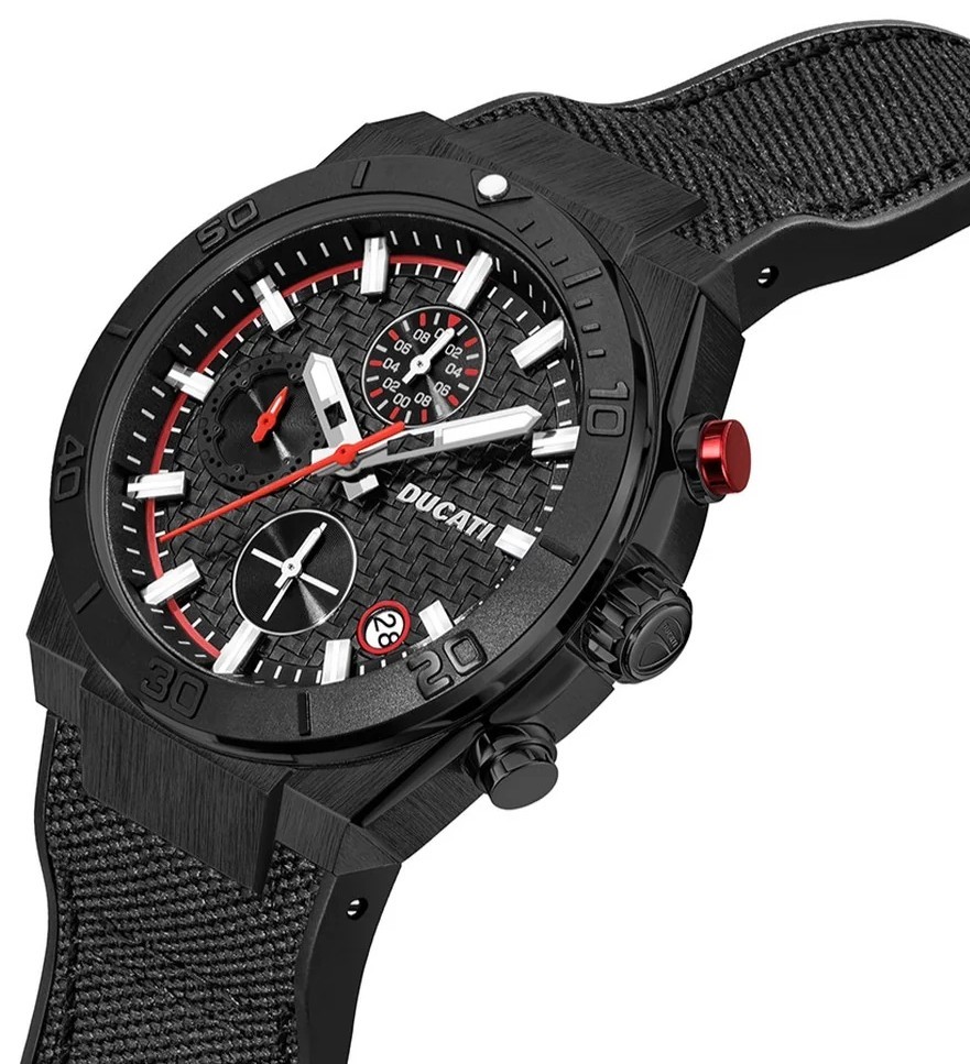 Orologio Ducati Corse by Locman cronografo con cassa da 43,5mm in acciaio trattato PVD nero e lunetta con numeri a rilievo in stile sub quadrante nero e rosso con logo Ducati, cinturino in tessuto di nylon nero con interno in silicone cod DTWGO0001201.