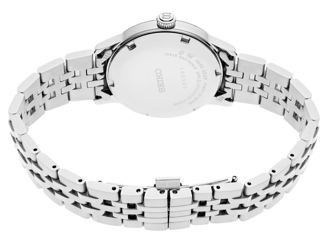 Bracciale in acciaio inossidabile regolabile, con chiusura a tripla sicurezza e logo Seiko. Distanza tra le anse 17mm.