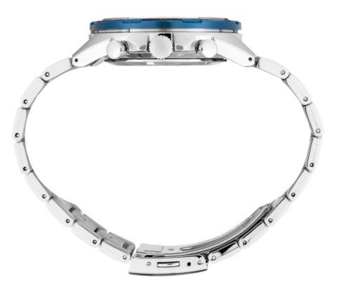 Il quadrante, di un blu intenso, racchiude tre contatori tipici dei cronografi ed è circondato da una lunetta con scala tachimetrica.