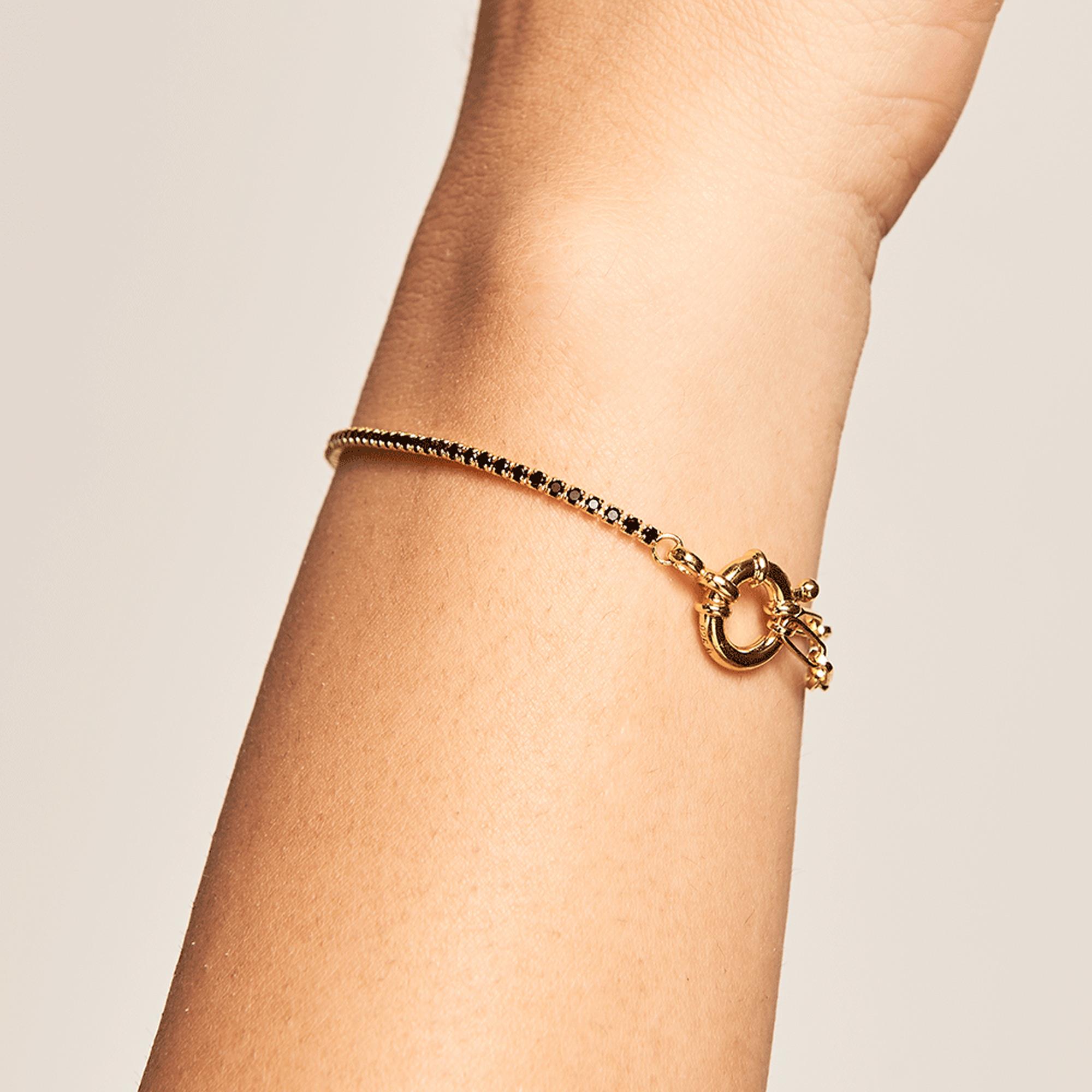 Abbracciando la sofisticatezza in un ambiente selvaggio e misterioso, il bracciale in Oro Black Mirage è l’unione di delicatezza e carattere in un design cosmico e brillante. Una fusione eclettica di eterne scintille e ferme catene di libertà: zirconi neri meticolosamente incastonati a mano in una base di argento sterling 925 e una placcatura in oro 18 carati. Un design ricolmo di moderno minimalismo in una collezione che rappresenta l’eterna dualità della donna di oggi: libera, sognatrice e lottatrice. Gioielli prêt-à-porter rifiniti a mano, una vera collezione di pezzi artigianali che utilizzano materiali di prima qualità e pietre semipreziose. Spessore catenina: 0,8 mm. Lunghezza catenina: 14 e 17 cm (2 chiusure).