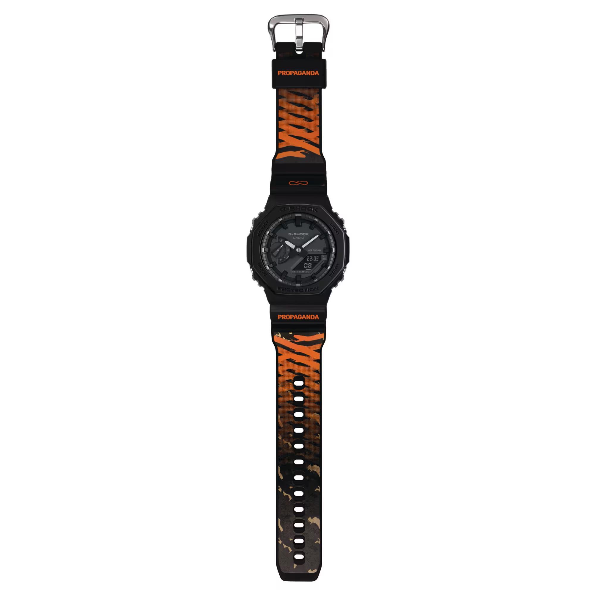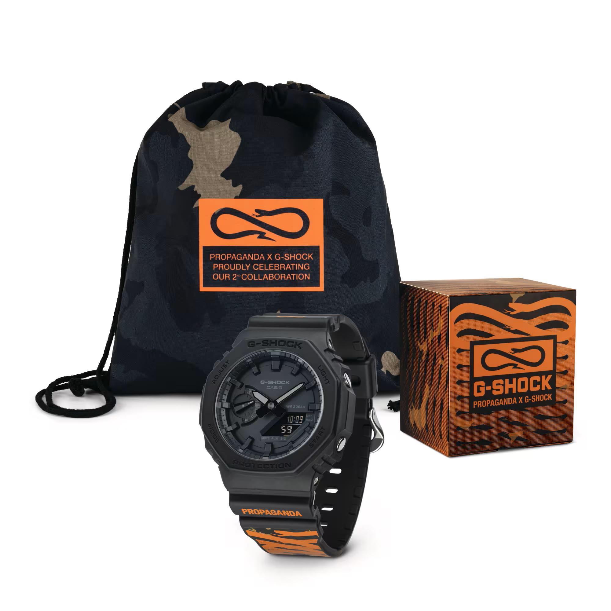 Scopri il collaboration model Propaganda x G-SHOCKIl nuovo modello GA-2100-1A1PPGD24, su cassa best seller G-SHOCK GA-2100, riprende il super iconico e riconoscibile snake logo Propaganda su tutto il cinturino, con tonalità arancio accese e accattivanti. La base invece è creata con un pattern camouflage che rappresenta l’iconica forma a stivale dell’Italia.L’orologio viene venduto in un esclusivo special pack customizzato e con una drawstring bag che richiama il pattern della collabo.