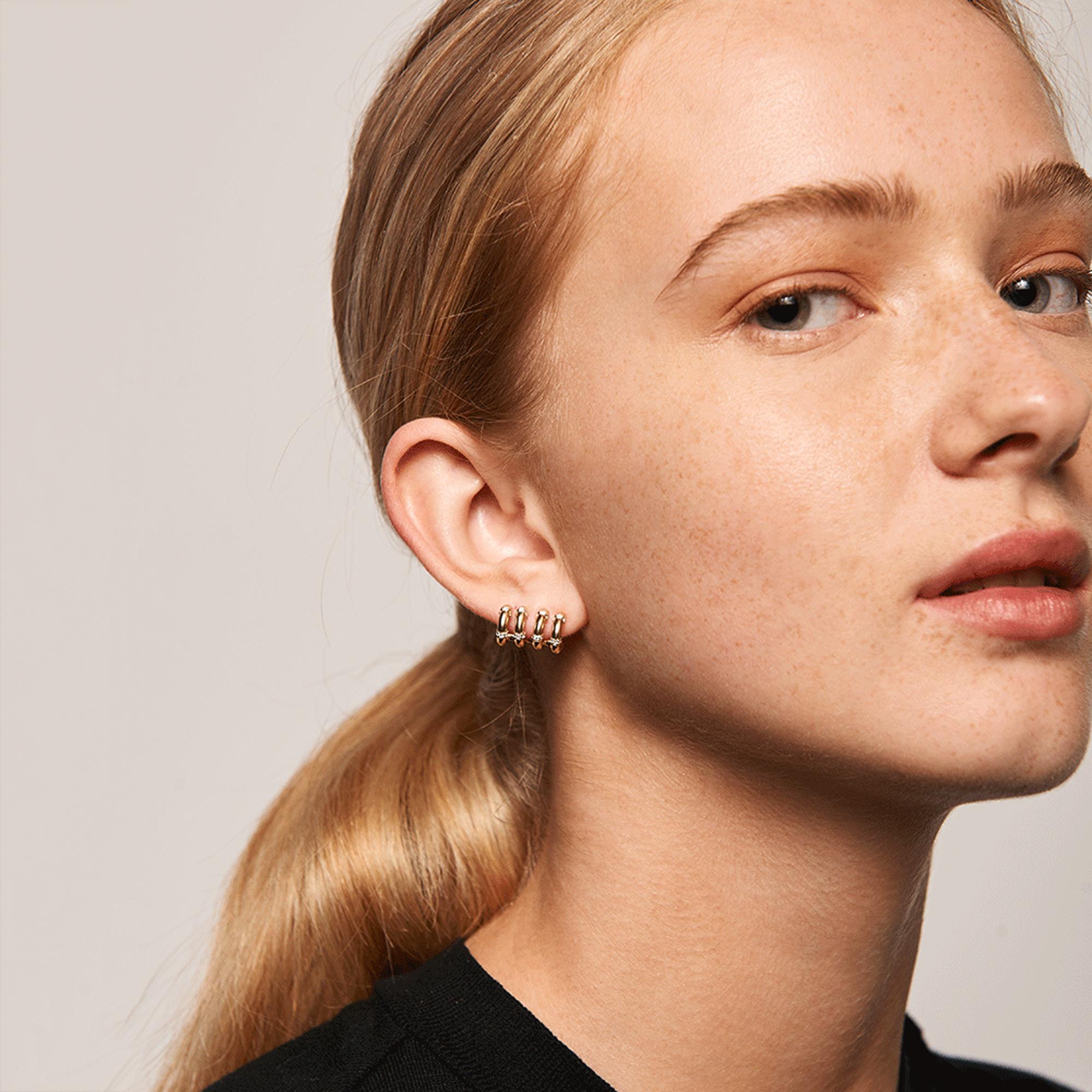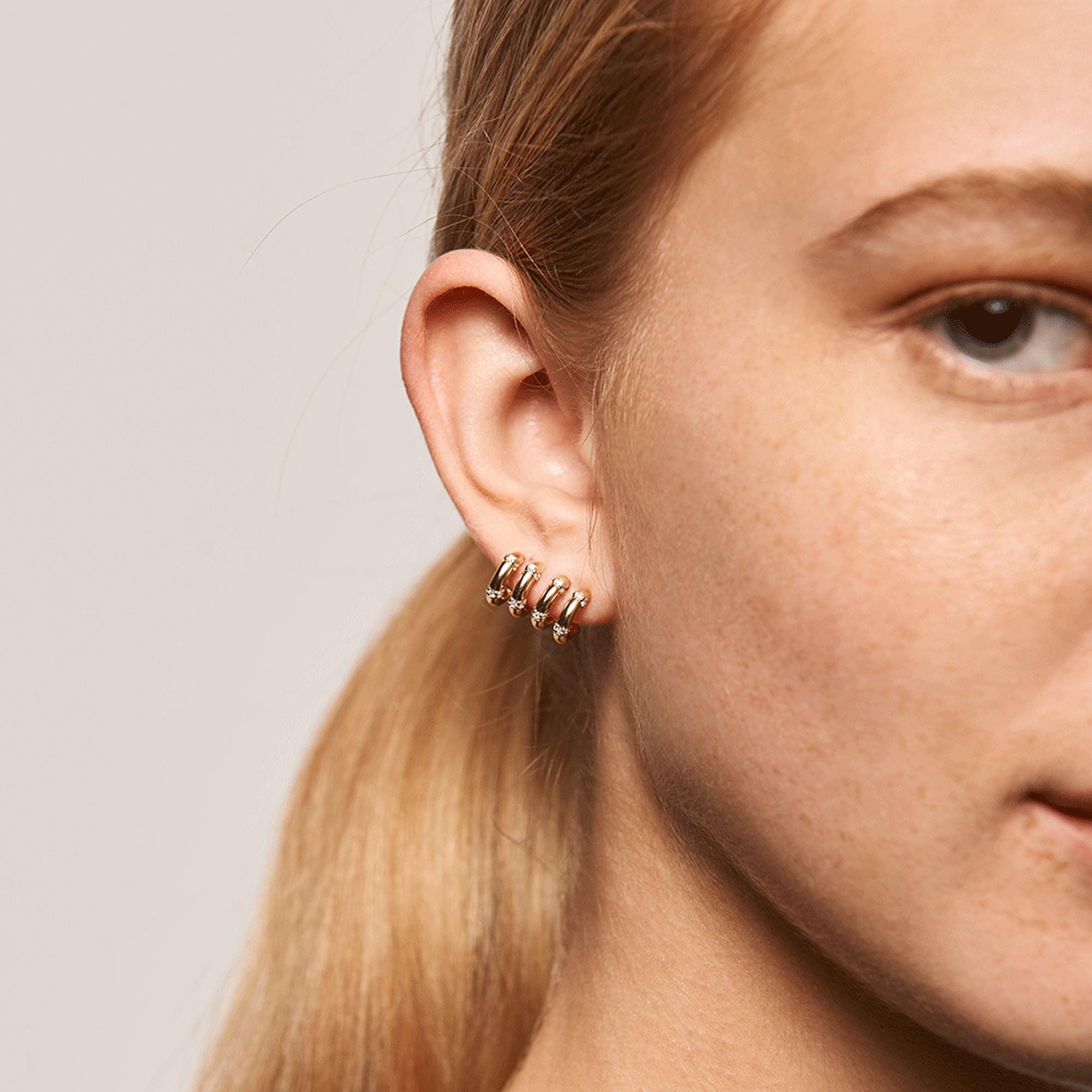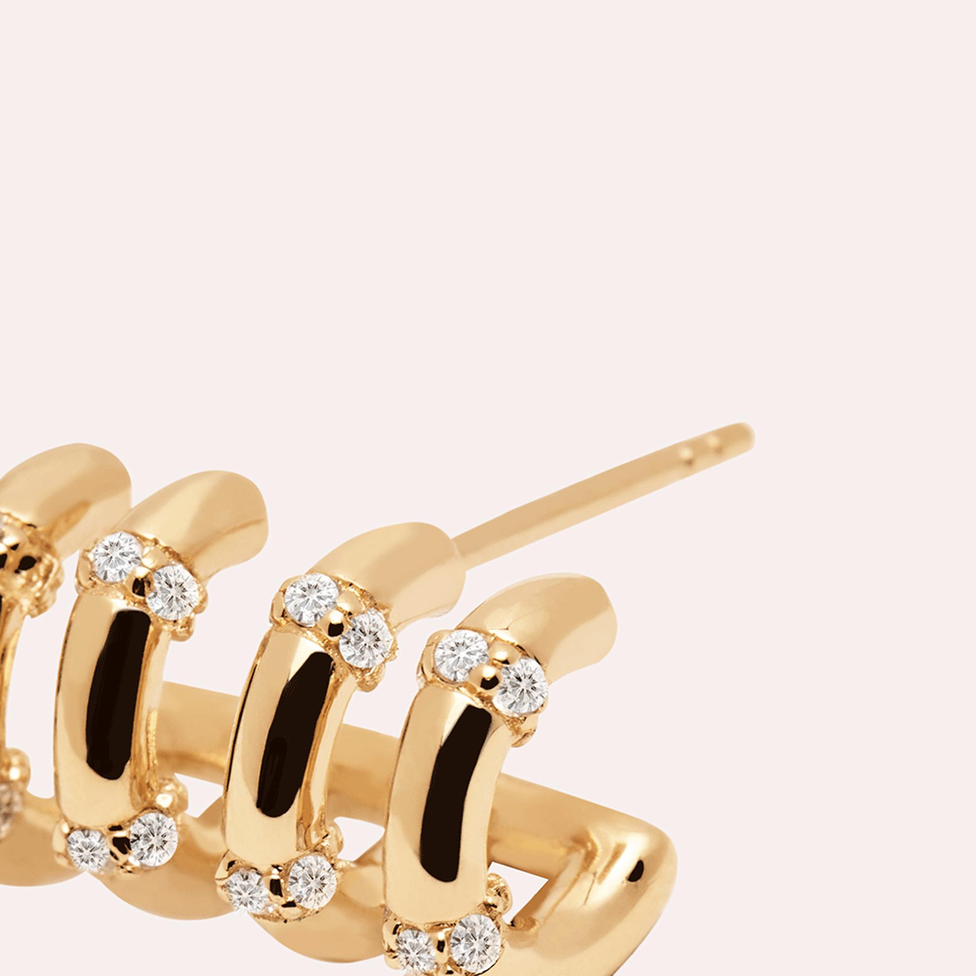Quattro delicati cerchi, incoronati da splendenti zirconie bianche, distinguono gli orecchini Giselle Gold. Questi gioielli così esclusivi vengono realizzati in argento sterling 925, placcati in oro 18k, e accuratamente lucidati a mano. Intrisi dell'atmosfera delle festivitá della costa mediorientale, gli orecchini Giselle Gold sono raffinati e sauvage: riflettono un atteggiamento di permanente audacia e eleganza. Gioielli prêt-à-porter rifiniti a mano, una vera collezione di pezzi artigianali che utilizzano materiali di prima qualità e pietre semipreziose. Tipo di chiusura: A chiodo classica. Diametro del cerchio: 10 mm. Peso: 3.4 g.