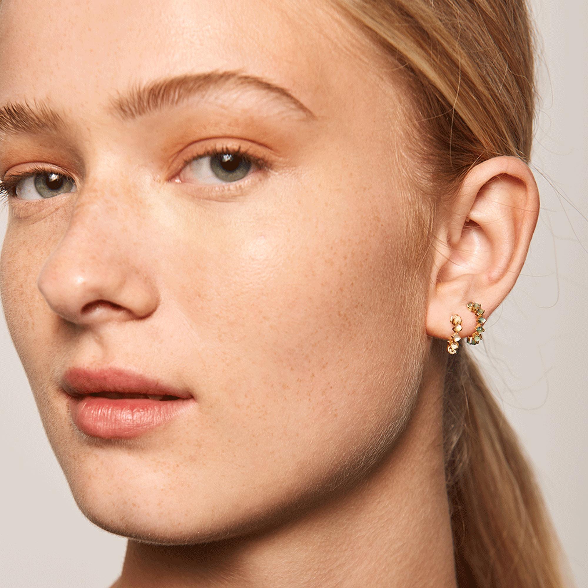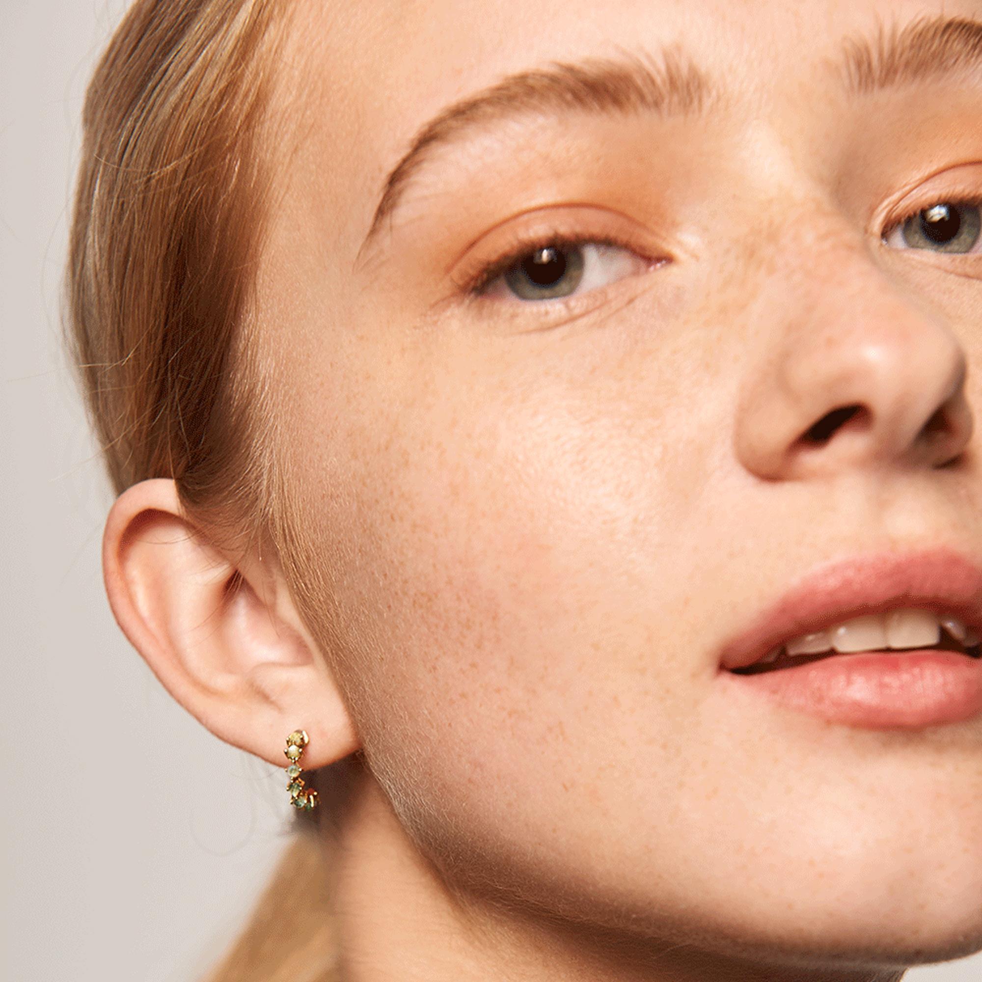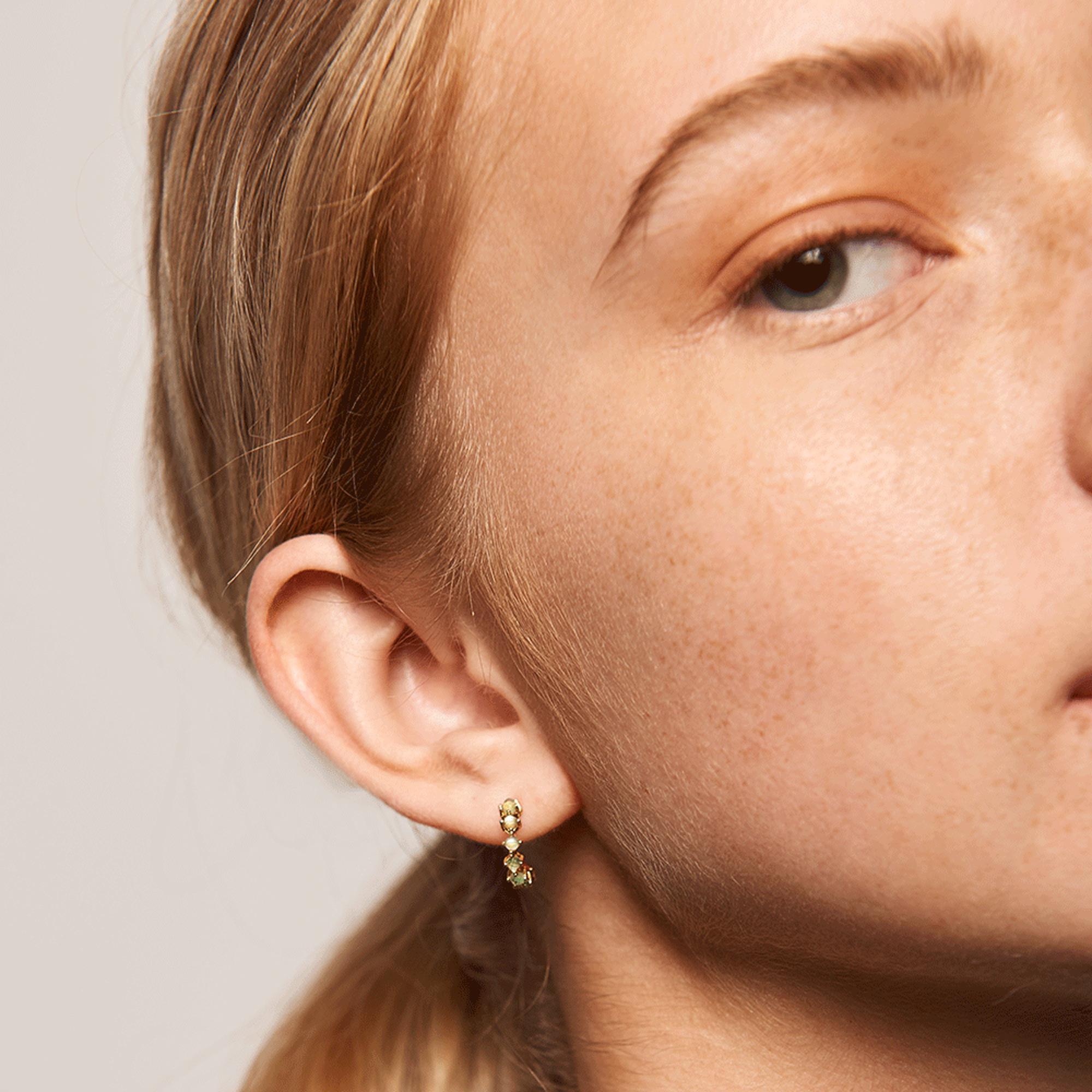 Gli orecchini Mint Bird combinano la purezza e la delicatezza dei modelli della collezione Citric. Cristalli color turchese sono incastonati a mano su una base in Madreperla, creando una scelta elegante per un look quotidiano. Attentamente lucidati e placcati in oro 18 carati su dell’argento sterling 925. Gioielli prêt-à-porter rifiniti a mano, una vera collezione di pezzi artigianali che utilizzano materiali di prima qualità e pietre semipreziose. Diametro del cerchio: 7 mm. Sistema di chiusura: Vite tradizionale. Peso: 1.4 g.