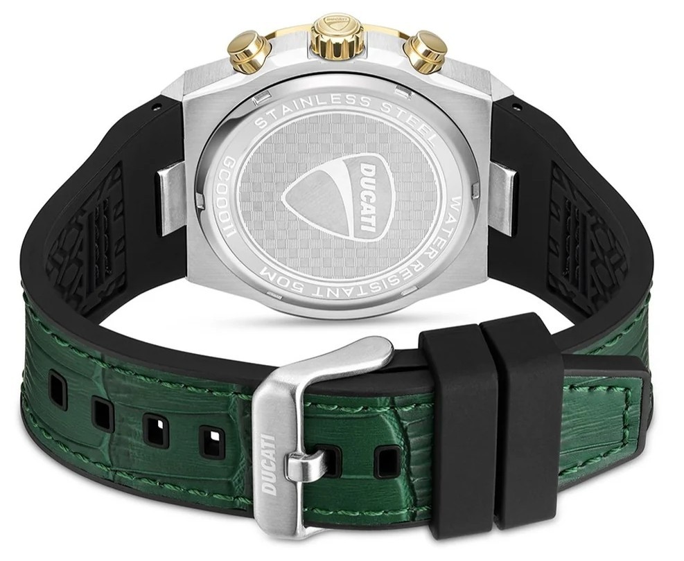 Orologio Ducati Corse by Locman cronografo con cassa da 43,5mm in acciaio e lunetta ottagonale dorata gialla, quadrante verde con logo Ducati e finiture oro, cinturino in pelle verde e interno in silicone. cod DTWGC0001101.
