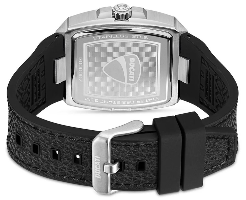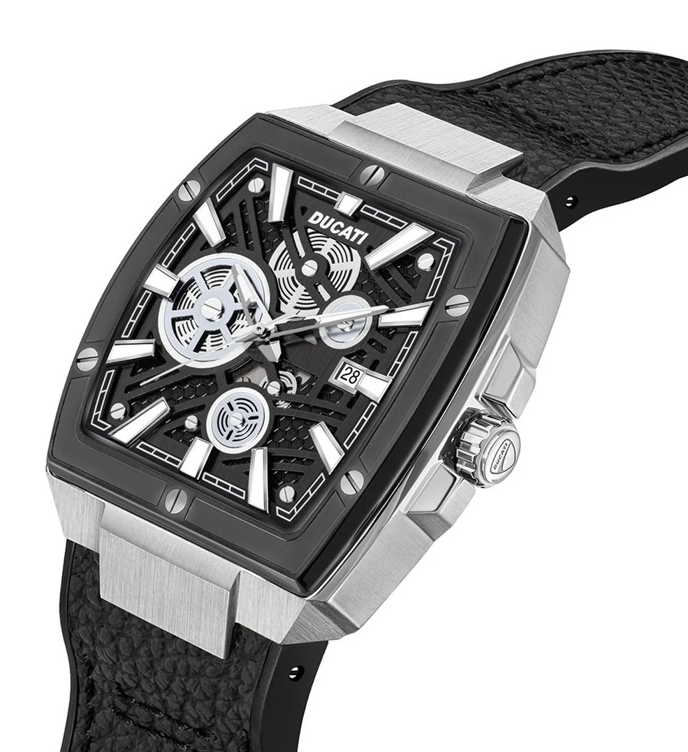 Orologio Ducati Corse by Locman cassa tonneau da 40mm in acciaio con lunetta e quadrante nero scheletrato con logo Ducati, cinturino in pelle con interno in silicone cod DTWGB0000701