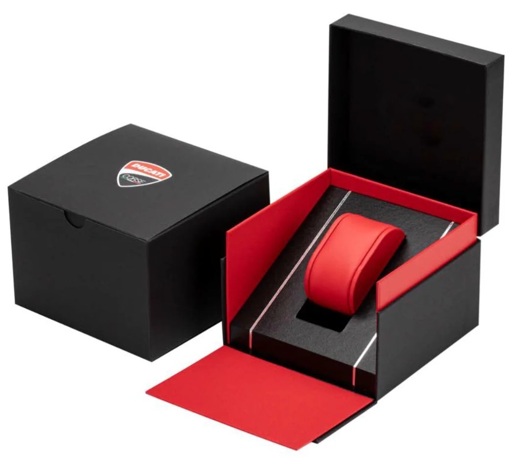 Questo modello è parte della linea DT002 in cui il design del quadrante richiama le strutture dei motori per un maggiore carattere sportivo.