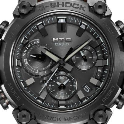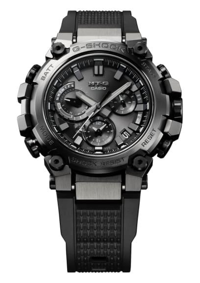 Scopri una forma innovativa di grande bellezza strutturale, un orologio MT-G nato da un concetto di design completamente nuovo che combina la resina utilizzata nei primi modelli G-SHOCK con materiali metallici. Benvenuti a un livello completamente nuovo di sofisticato design strutturale. Grazie alla sua struttura di protezione a doppio nucleo ancora più avanzata, il modello MTG-B3000 protegge il modulo in una cassa in resina rinforzata con carbonio e racchiude l'esterno in componenti metallici. La pressatura, il taglio e la lucidatura ripetuti ricostruiscono la cassa in acciaio inossidabile verso l'alto in un'intricata forma in 3D. La parte posteriore della cassa serve, come alette, per fissare il cinturino e per proteggere corona e pulsanti, per una struttura completamente nuova. Utilizzando la tecnologia di montaggio ad alta densità, abbiamo sviluppato un nuovo modulo multifunzione più sottile. Tutti questi design e tecnologie innovativi hanno creato un orologio molto più sottile, con una misura di soli 12,1 mm dalla cornice alla parte posteriore della cassa. L'innovazione MT-G si estende anche al cinturino. La nuova struttura di sostituzione one-touch elimina la necessità di attrezzi speciali. Il vetro zaffiro ad alta trasparenza abbinato alla delicata modellatura e deposizione a vapore della nanotecnologia Yamagata Casio aggiunge un tocco finale di raffinatezza e qualità. In elegante nero e grigio monocromatico, il modello MTG-B3000B è dotato di un morbido cinturino in uretano. Questo nuovo stile innovativo e resistente offre funzionalità complete. Scarica l'app CASIO WATCHES da abbinare allo smartphone tramite Bluetooth®. Grazie al Multi Band 6, al sistema di alimentazione Tough Solar e alla luce LED ad alta luminosità, questo orologio garantisce prestazioni ottimali, qualunque siano le tue avventure.