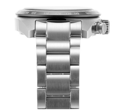 quadrante nero con datario, vetro zaffiro, LUNETTA con rivestimento in carbonato di titanio, LANCETTe in LumiBrite, bracciale in acciaio, resistenza all'acqua 10atm